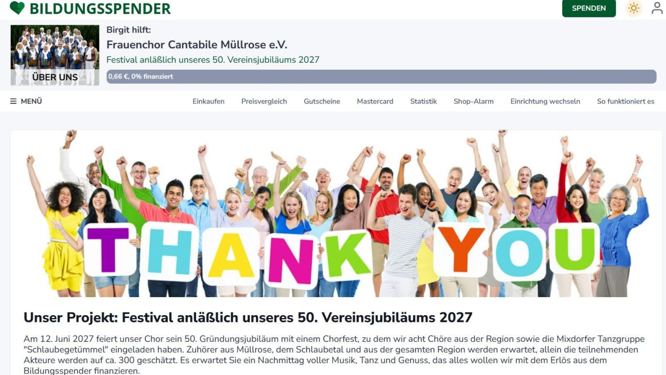 Unterstütze uns mit deinem Einkauf im Internet ganz ohne Mehrkosten, indem Du über den nachfolgenden Link, dem Bildungsspender, gehst. Besonders die Anschaffung von Notenmaterial ist sehr kostenintensiv - diese Kosten werden beispielsweise durch die Einnahmen aus dem Bildungsspender finanziert. Schon einmal vielen Dank für Deinen Einkauf über den Bildungsspender und Deine Unterstützung!